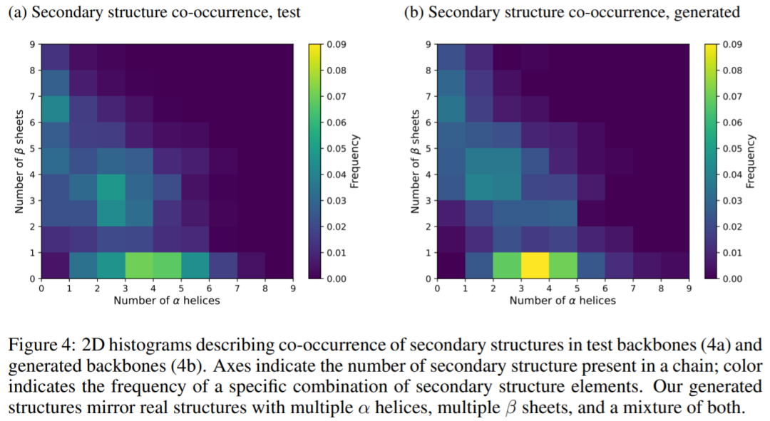下图为在测试主链 (4a) 和生成主链 (4b) 中出现二级结构的二维直方图,结果表明生成的结构反映了蛋白质真实的结构,有多个α螺旋,多个β sheets ,以及两者的混合。