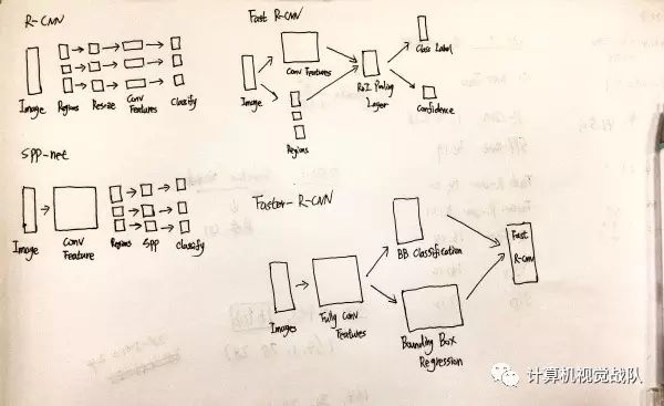 我就自己画了下最近四个较流行的框架简单图(R-CNN、SPP-Net、Fast R-CNN和Faster R-CNN),如有不对地方请指正谢谢!
