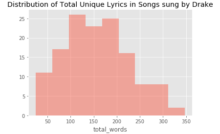完成文本数据的清理之后,我开始分析每首歌曲中独特词的数量。如下图所示,是 Drake 所有歌曲中独特歌词分布的直方图。他的大部分歌曲似乎都有 100~200 个独特的词。由于我没有分析其他歌手歌词的情况,无从参考,因此这张直方图并没告诉我多少关于 Drake 创造力的内容。