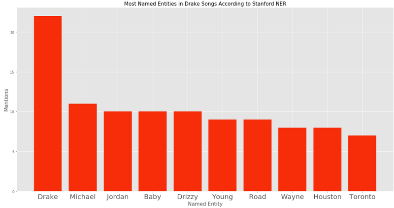命名实体识别(Named Entity Recognition ,NER)是“一项信息提取的子任务,它试图将文本中命名的实体定位和分类为预定义的类别,如人名、组织、地点、时间、数量、货币价值、百分比等”。NER 是一项特别棘手的任务。英语的复杂性使得很难创建一个对所有文本源都准确的 NER 算法。算法可能在一个文本语料库 (在我们的例子中是 Drake 歌曲集) 上表现得很好,然后在另一个语料库上表现得很差。这种不一致使得有必要尝试几种 NER 算法。正如你将看到的,算法也不是非常不准确。