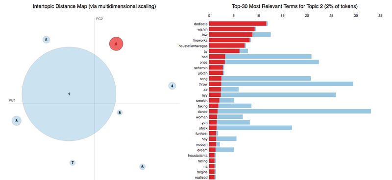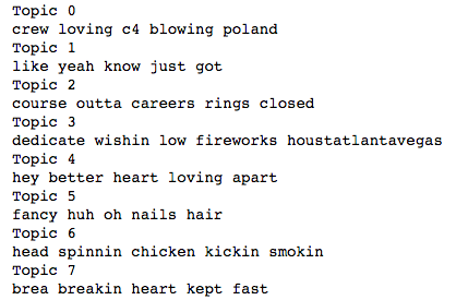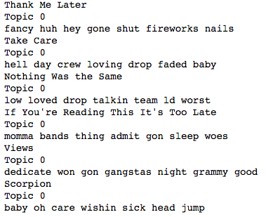 我想使用 LDA 做的的第一件事就是学习 Drake 所有歌曲中最突出的主题。为了做到这一点,我把所有的歌都列在了一个列表里。然后,利用 SciKitLearn 的 CountVectorizer,我创建了一个词袋(Bag Of Words)表示所有这些歌曲。词袋是通过矩阵表示(matrix representation)来表示单词的一种简单方法。然后使用 SciKit 学习 LDA 版本,我建立了一个模型,在给定的文本中,找到 8 个主题。