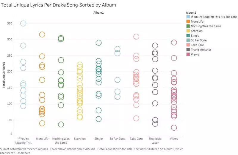 要发现 Drake 的创造力的更好方法是,通过专辑来搞清楚他的创造力。下图是我用 Tableau 中创建的。x 轴是作品的名称,y 轴是独特词的数量。每个泡泡代表一首歌。我发现,就独特的歌词而言,没有一张专辑看起来更有创意。然而,似乎每一部作品都至少有一些独特词(不包括《Scorpion》)。他最近发行的专辑《Scorpion》上的歌曲数量很多(总共 25 首),但独特词上几乎没有什么变化。