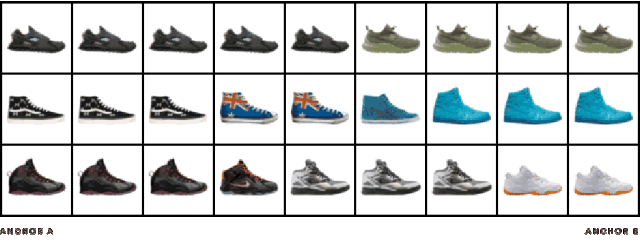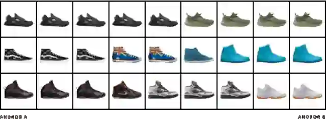 为了展示学习后的流形并检查学习曲面的“平滑度”,我们通过插值法进一步可视化。选择看似不同的潮鞋作为锚点(anchors),然后判断它们在隐空间中的过渡。每个隐向量的插值被解码成图像空间的视觉检验,并与整个目录里最接近的实际产品相匹配。动图说明了映射学习特征的概念。
