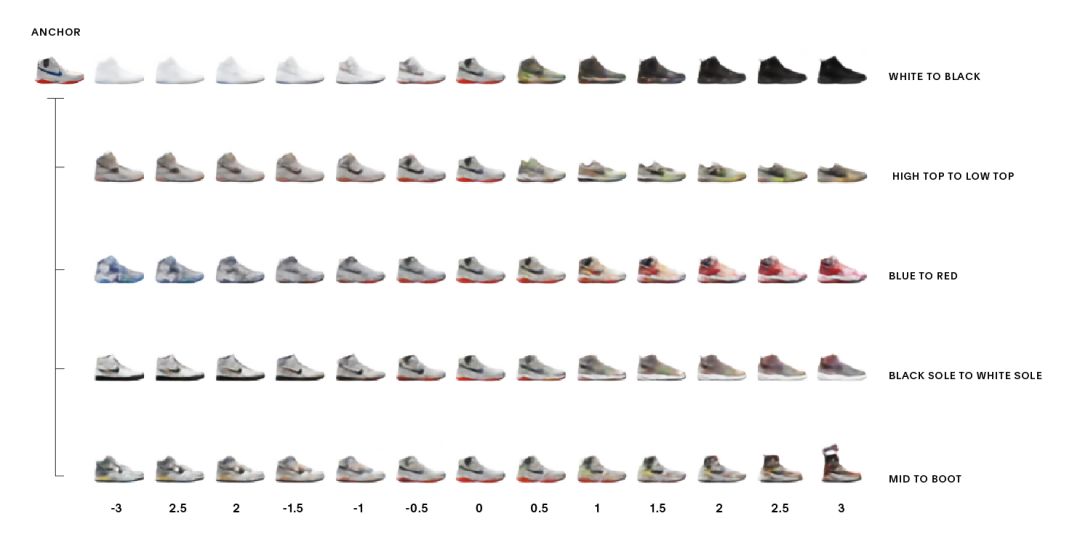 该模型倾向于在每个维度创建更多独立的人类可解释因子,这称之为解纠缠(disentanglement)。首先,模型着重对比鞋底和鞋面差别来重新构建最合适的轮廓。然后,重构整个轮廓的灰色梯度,再开始学习基础颜色。在了解了轮廓类型之后,例如,靴子还是潮鞋,高帮还是低帮,网络开始处理复杂的设计款式和颜色,这些都是最终的差异性因素。