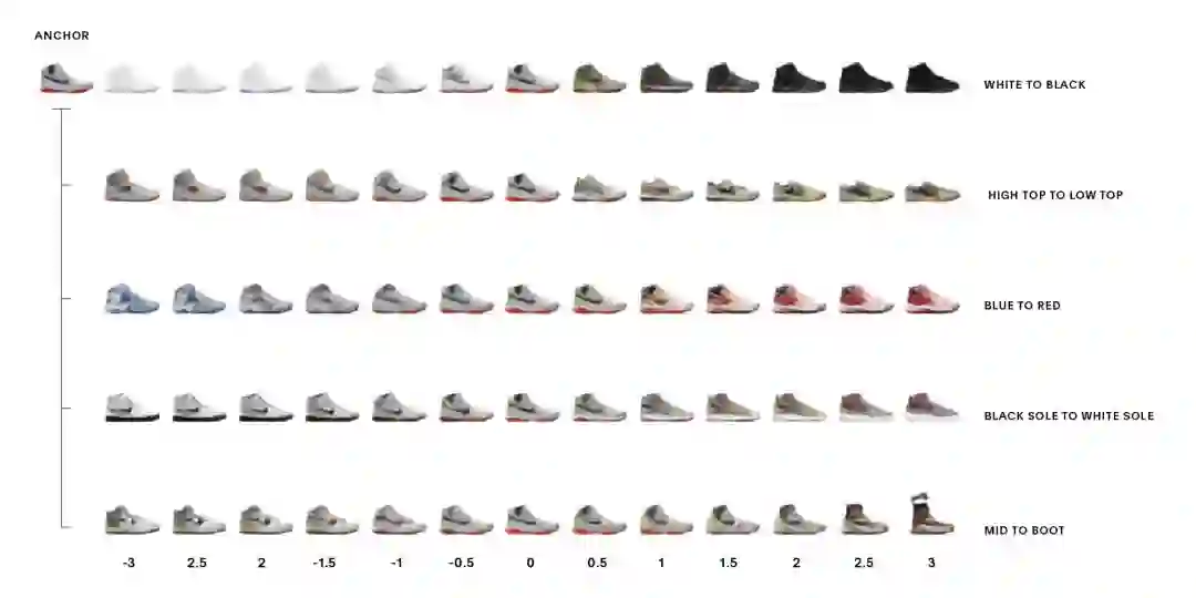为了进一步探索隐空间,我们使用单双潮鞋,每次在每个方向修改一个隐因子,观察它是如何变化的。因子表示“中帮“或“靴子”的属性和鞋底颜色只是网络学习到的一小部分可感知的视觉特征。不同模型的隐因子数量和彼此间独立性各有差异。解纠缠的特性是我们研究的一个活跃领域,期望借此改善模型的嵌入。