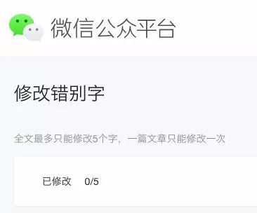 昨晚,微信公众号上线针对已发布文章的修改错别字功能,不过只能修改5个字,标题无法修改,且一篇文章只能修改一次。 文外的封面题图、摘要和图文选项(如原创、留言等)暂不支持修改。另外,正文中只要是属于摘要的内容均不可进行修改。