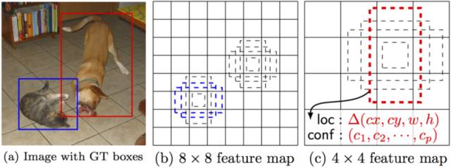 正如我上面提到的那样,“额外的特征层”在最后尺寸将缩小。这些不同大小的特征映射有助于捕获不同大小的目标。例如,以下是SSD的操作: