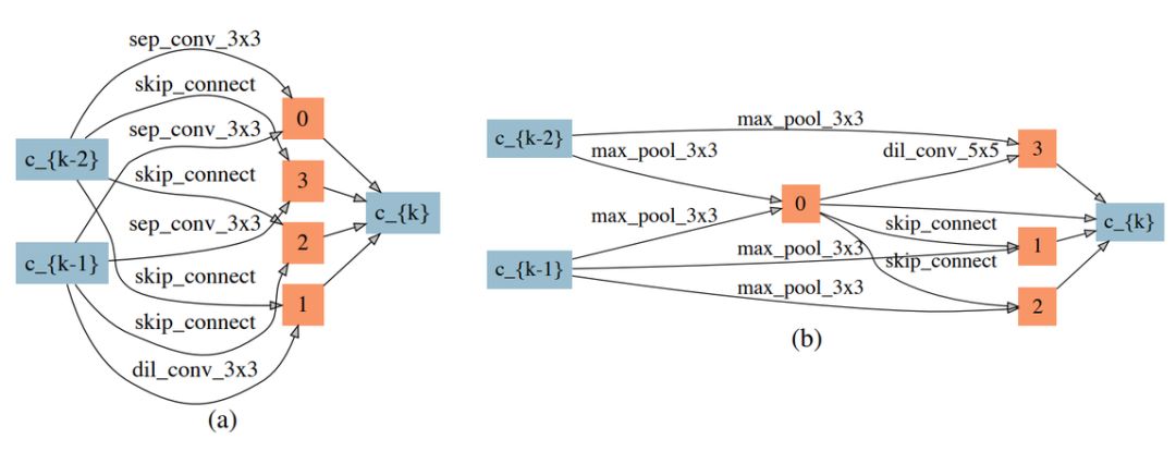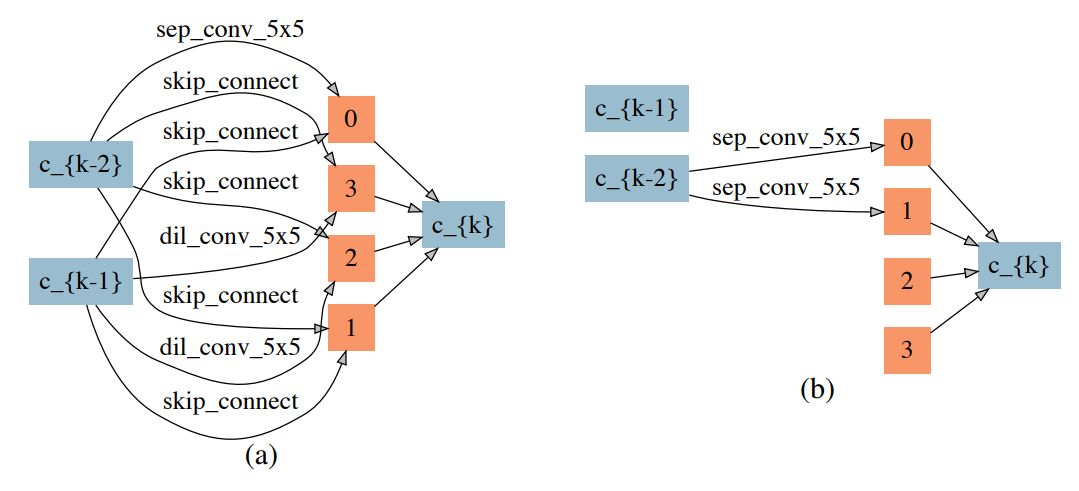 图 2:在 CIFAR-10 数据集上的神经架构(子网络)的随机神经网络架构搜索(带有较弱的约束)。(a)正常的神经架构。(b)删减后的神经架构。