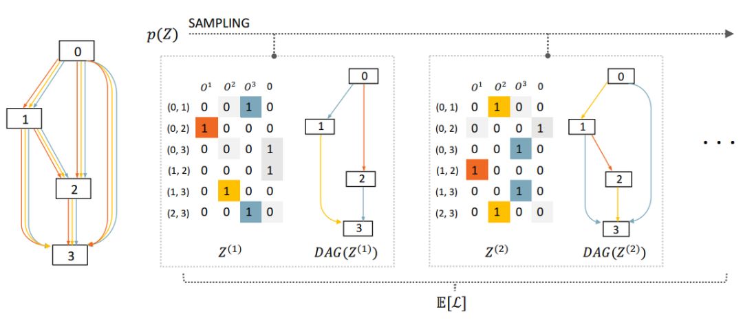 图 1:SNAS 中前向传播的概念的可视化结果。Z 是一个从分布 p(Z) 中采样得到的矩阵,其中每一行的 Z_(i,j) 是一个随机变量的 one-hot 编码向量,表示将掩码和有向无环图(DAG)中的边(i,j)相乘。该矩阵的列对应于运算 O^k。在本例中,有四个候选的操作,其中最后一个操作为零操作(即移除这条边)。目标函数是所有子图的泛化损失 L 的期望。