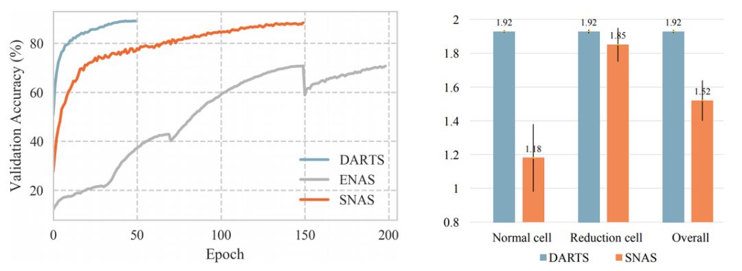 图 3(左):SNAS、DARTS 以及 ENAS 的验证准确率随着搜索进度不断推进的变化情况。图 4(右):SNAS 和 DARTS 中的架构分布的熵。