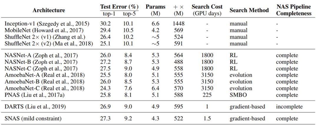 表 3:在 ImageNet 数据集上,SNAS 和最先进的图像分类的分类误差。