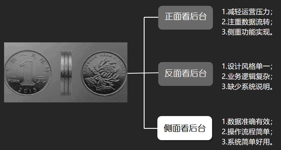在做后台产品设计之前,我们先从硬币的三个面了解一下后台系统。从硬币正面看后台:可以减轻运营的压力,注重数据之间的流转,侧重功能模块的实现。从硬币反面看后台:设计风格过于单一,业务逻辑复杂,缺少对应的系统说明。从硬币侧面看后台:数据处理准确有效,操作流程简单,系统简单好用。