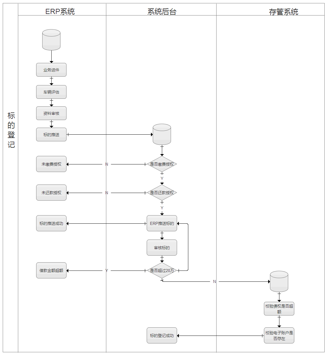 以标的登记审核流程为例:我们以泳道图的形式,设计ERP系统、P2P系统和存管系统的业务流程,风控专员在ERP系统提交标的进件后,风控主管会在P2P系统后台进行初审和复核,之后再推送到存管系统进行终审,在这个过程会形成动态的标的登记审核流程。