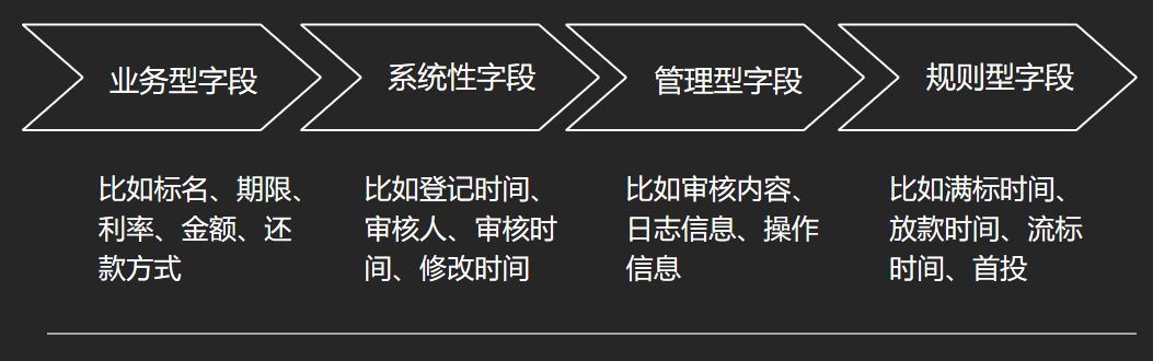 以P2P网贷系统的标的为例:标的详情会展示标名、期限、利率、借款金额、还款方式等;标的登记会记录登记时间、审核人、审核时间等;标的流标会记录审核内容、日志信息、操作信息等;标的放款会记录满标时间、放款时间、放款状态等。