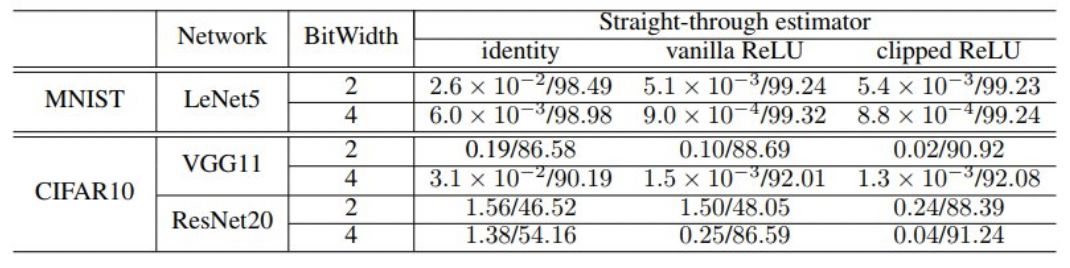 表 1:使用量化激活和浮点权重,三种不同的 STE 在 MNIST 和 CIFAR-10 数据集上的训练损失/验证准确度(%)。测试了 2 和 4 位的位宽。