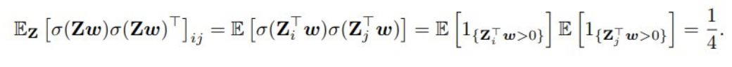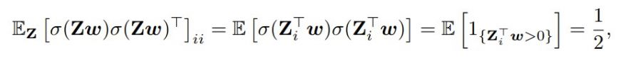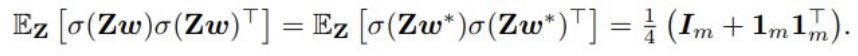 也就是说,E_Z[ σ(Zw) σ(Zw)^T ] 沿对角的元素等于 1/2,其它地方为 1/4。E_Z[ σ(Zw*) σ(Zw*)^T ] 也有一样的参数。