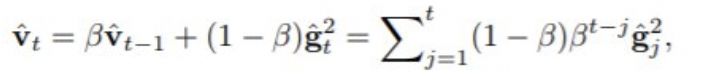 其中 g_t 是随机梯度,β 是 Adam 等深度网络优化器中可直接使用的一个超参数。移动平均线是通过之前在 t-1 的移动平均线、在时间 t 的当前梯度的平方与决定每个分量所受重视程度的参数 β 的凸组合(convex combination)而计算得到的。