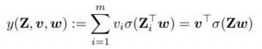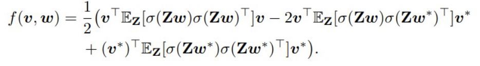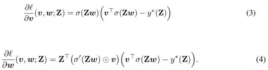 其中 Z ∈ R^(mxn) 是输入,w ∈ R^n 和 v ∈ R^n 分别是第一和二层线性层的权重。(Z_i)^T 表示 Z 的第 i 行,σ( ⋅ ) 是在向量 Zw 上逐分量工作的激活函数。第一层用作卷积层,第二线性层用作分类器。标签根据 y*(Z) = (v*)^T σ(Zw*) 生成,其中 v* 和 w* 是一些最优参数。式 (1) 描述了损失函数,其就是一个简单的平方损失: