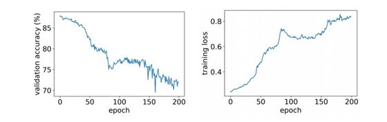 图 3:在带有 2 位激活的 ResNet-20 上,截断式 ReLU STE 所得到的验证准确度和训练损失。激活准确度和训练损失在粗粒梯度方向上都随 epoch 数量而增长。