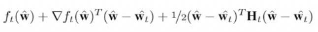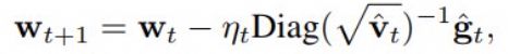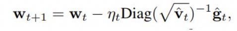 其中优化是针对 ^w 而言,Ht 是指在 ^w 的 Hessian。某些读者可能了解这个,而且知道这是 ft(^w) 的二阶泰勒展开。在实践中,Hessian 往往具有高昂的计算成本,所以往往使用近似的 Hessian。这里也是如此,这里的 Hessian 近似为了 Diag( √^v_t),其中 ^v_t 是移动平均线(moving average)。