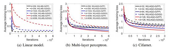 首先我们看看图 2(a),这代表使用平方损失的合成式简单线性模型。可以看到,随着维度增大,其训练损失随迭代的收敛速度就越慢。在 d 更大时,全精度和量化梯度都会导致收敛上的损失更大。前一节的分析也能推知这样的结果。