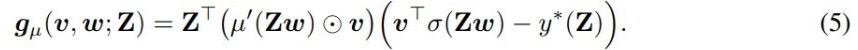 (5) 中使用了 ReLU 函数 µ(x) = max(x, 0) 的导数作为 STE。不难看出 µ'(x) = σ(x),全梯度 ∇ f(v, w) 的表达式如下所示。
