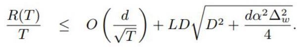 其中 R(T) 是后悔值。这里,平均后悔值的收敛速度为 d/√(T),其中 d 是维度。还有一个与权重量化分辨率 ∆_w(量化层级之间的步长)和维度相关的非零项。L 是 ft 的梯度的 Lipschitz 常数,D 也是一个常数,其为所有 w\m, wn ∈ S(S 是量化权重值的集合)限定了 || w*\m - w_n* || 的边界。