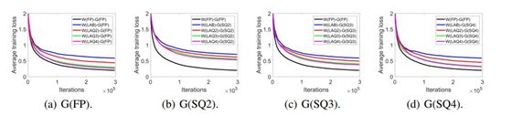 图 3 展示了不同位数的量化权重下平均训练损失的收敛情况。结果表明,使用全精度或量化的梯度时,权重量化网络在收敛后的训练损失比全精度网络更高。使用的位数越多,最终损失就越小。这确认了分析部分的结果,也是我们直观上能预期的结果。