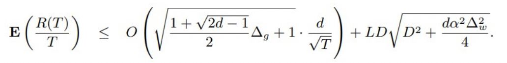 其中 (~g_t) 是随机量化的梯度 Q_g(∇f_t(Q_w(w_t)))。(~v_t) 是平方的量化梯度的移动平均线。在这种设置下,期望的平均后悔值的边界为: