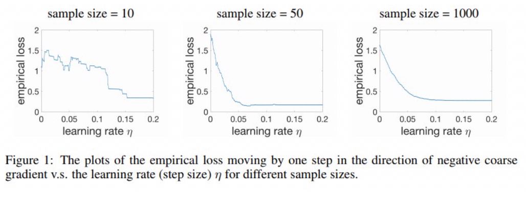 作者在论文中给出一个说明,其表示粗粒梯度下降的收敛保证基于训练样本无限的假设。在仅有少量数据时,在粗粒尺度上,实验损失大致会沿负粗粒梯度方向下降。随着样本规模增大,实验损失会变得单调和平滑。图 1 给出这一思路的图示。