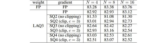 每个工作器的 mini-batch 大小设置为 64。其中测试和比较了 3 位量化的权重(LAQ3),全精度或随机量化到 m = {2, 3, 4} 位(SQm)的梯度。表 1 展示了不同工作器数量下的测试准确度。