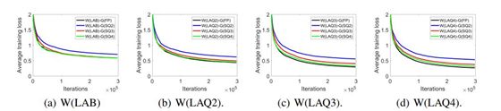图 4:在 CIFAR-10 上不同位数的梯度下的收敛情况。其权重是二值化的(记为 W(LAB))或 m 位量化的(W(LAQm))