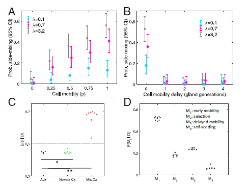 研究人员对19个结直肠癌患者肿瘤细胞的多区域和单个腺体数据进行近似贝叶斯计算,指出早期肿瘤细胞的特异性突变对肿瘤转移的影响。研究人员使用基因组测序技术在大多数侵入性样本中发现了早期异常细胞移动,并发现与其相关的特异性突变。
