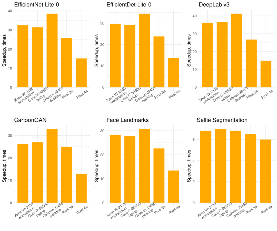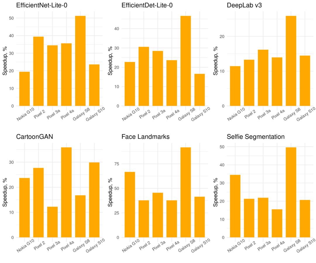 在六个 Android ARM64 移动设备上,XNNPACK 与默认的 TensorFlow Lite 量化内核相比,平均提升 30%。