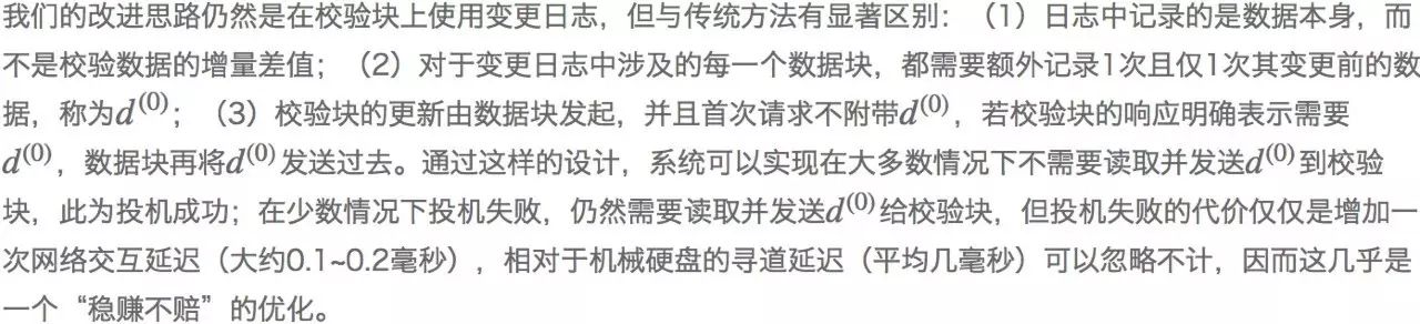 目前业内已有许多工作对这一问题进行改进,其中最具代表性的工作是2014年发表在FAST技术会议上的“Parity Logging with Reserved Space: Towards Efficient Updates and Recovery in Erasure-coded Clustered Storage”,它的核心思路是通过在校验块上记变更日志的方式来减少其上不必要的读操作,同时将随机写变成顺序追加写,以改善写入性能。然而它并不能改善原始数据块上的写流程,这构成了大多数的写操作,所以系统总体写性能改善有限。