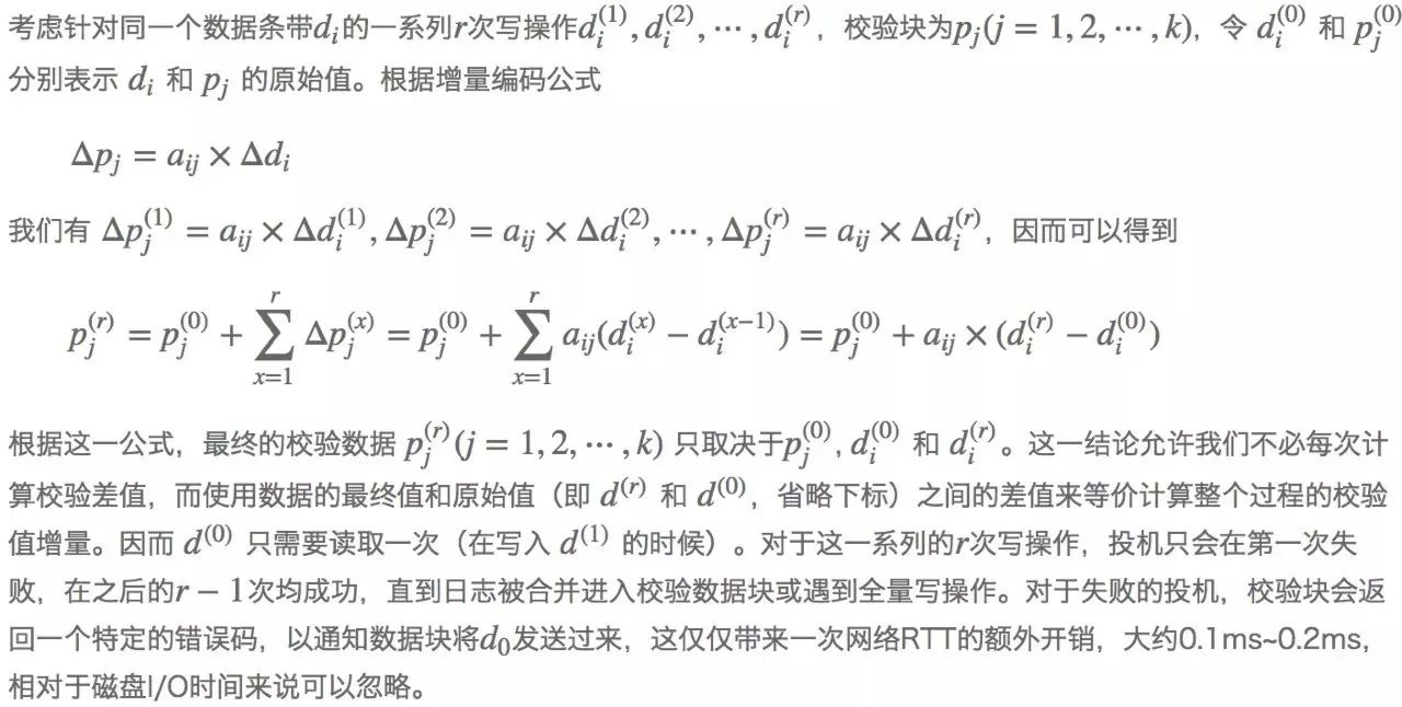 处理部分写的最直接办法是将不被写的数据块读出来,跟新数据组合在一起,然后再整体编码并写入。目前Ceph、Sheepdog等系统都采用了这种办法。一种简单有效的改进是将被覆盖数据的原始值读出来,然后根据新旧数据的差值来进行增量编码,得到各个校验块的差值,并“加”到各个校验块上。这种方法可以显著减少系统总体I/O次数,然而它需要对涉及的数据块和所有校验块进行原地读写(即在同一位置进行先读后写),在没有缓存的情况下(常态),HDD需要花费8.3毫秒(7200RPM)的时间旋转一周才能完成写入请求,跟一次随机I/O的平均寻道时间相当。这样的流程极大地影响了写入效率,即便应用层面发出的是顺序写操作,最终得到的性能也跟随机写差不多。