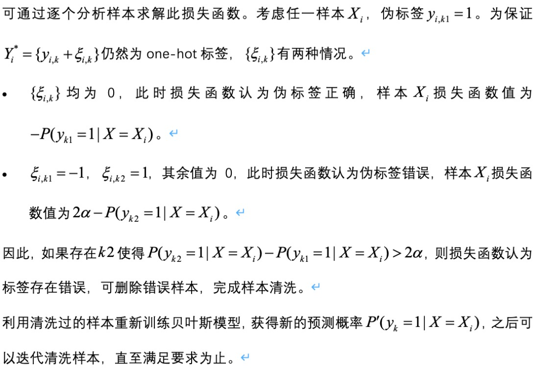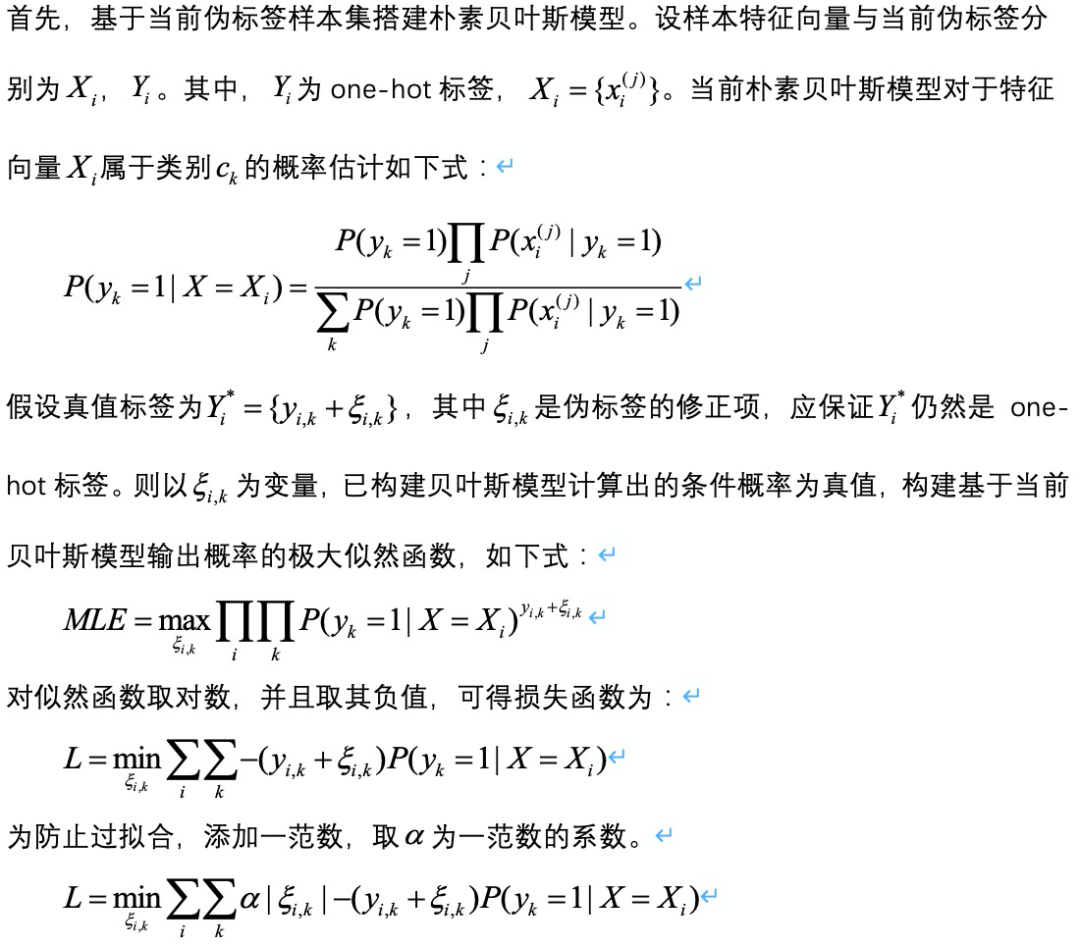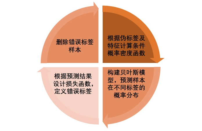 我们基于贝叶斯分类器的分类结果,提出基于伪标签极大似然估计的伪标签损失函数,完成错误样本清洗,再迭代完成贝叶斯分类。该模型的迭代流程如下图所示。