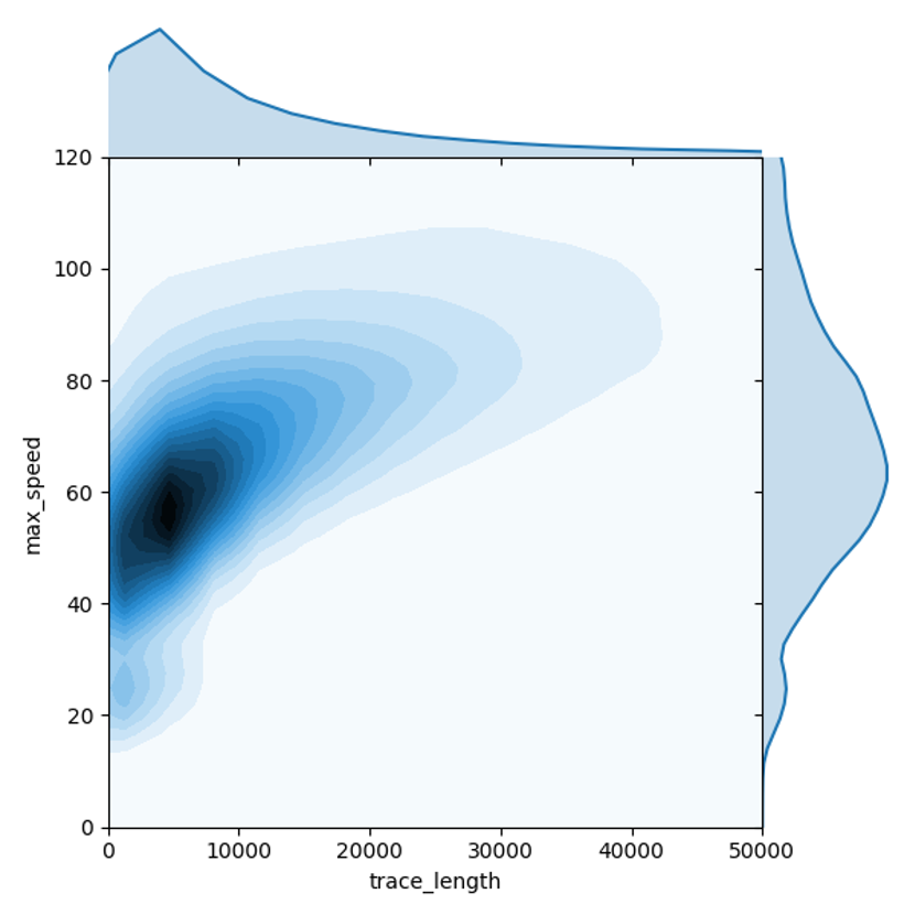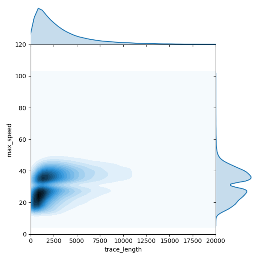 但是,行驶距离与最大速两个维度的特征并不相互独立。上图构建了针对汽车轨迹这两个维度的联合概率密度函数,可以发现,对汽车轨迹而言,行驶距离越长,最大速可能越高,当汽车行驶距离超过10公里时,其最大速度小于50公里每小时的可能性很低。因此,通过构建行驶距离与最大速度两个维度的联合概率密度函数,替换两个独立概率的相乘,可以帮助解决长距离非机动车轨迹被误判为汽车的问题。