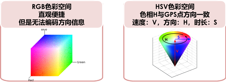轨迹颜色编码:从GPS点中获取的主要信息为速度、方向、等待时长。将这3个维度的信息进行轨迹颜色编码有2种方式,分别是RGB编码与HSV编码。其中HSV即色相(Hue)、饱和度(Saturation)、亮度(Value)。
