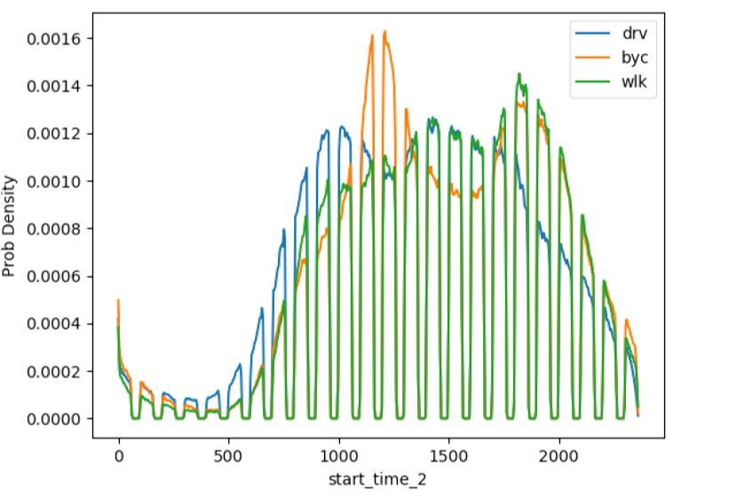 下面以轨迹开始时间特征为例,解释该特征的物理意义。其概率密度函数如下所示(drv,汽车;byc,自行车;wlk,步行):