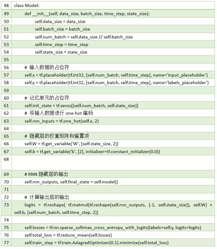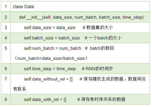 3. 在构造方法“__init__”中,我们初始化了数据集的大小“data_size”、一个batch的大小“batch_size”、一个epoch中的batch数目“num_batch”以及RNN的时间步“time_step”。接下来我们定义一个“generate_data”方法: