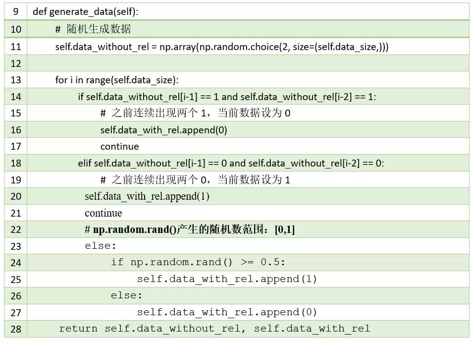 在第11行代码中,我们用了“np.random.choice”函数生成的由0和1组成的长串数据。接下来我们用了一个for循环,在“data_without_rel”保存的数据的基础上重新生成了一组数据,并保存在“data_with_rel”数组中。为了使生成的数据间具有一定的序列关系,我们使用了前面介绍的很简单的数据生成方式:以“data_without_rel”中的数据为参照,如果出现了连续两个1(或0)则生成一个0(或1),其它情况则以相等概率随机生成0或1。