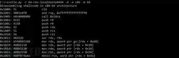 如果你不使用它的反汇编功能,仅仅只是将Sickle作为一个wrapper/dump的工具,那么你可以使用任意版本的Python环境(包括2.7)。这里需要说明的是,我在Windows 10上编写/测试64位shellcode时遇到了一些问题。因此,为了避免大家使用时出现同样的问题,我建议大家安装Python 3.4.4 (amd64) ,但对于其它版本的windows系统并不存在该问题。其次,如果你编写的shellcode为x86,则任意版本的Python都没影响,例如Python 3.7.0a3。以下是在Windows 10主机上测试msfvenom生成的shellcode(“windows / x64 / shell_reverse_tcp”)的用法示例