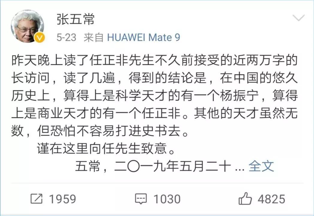 著名华人经济学家张五常评论说:在中国悠久历史上,称得上科学天才的是杨振宁,称得上商业天才的是任正非。其他天才虽然无数,但恐怕不容易打进史书去。