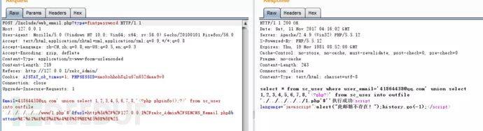 这里可以看到的确是可以注入的。这里我们发现可以直接构造语句,我们可以想到一个SQL直接写SHELL的神句。