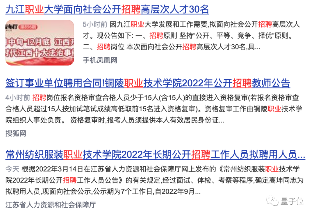 如果检索“职业院校+招人”的关键字,可以看到各个地区的职院都在招人,规模一般在几十人左右,不少还是长期招聘。