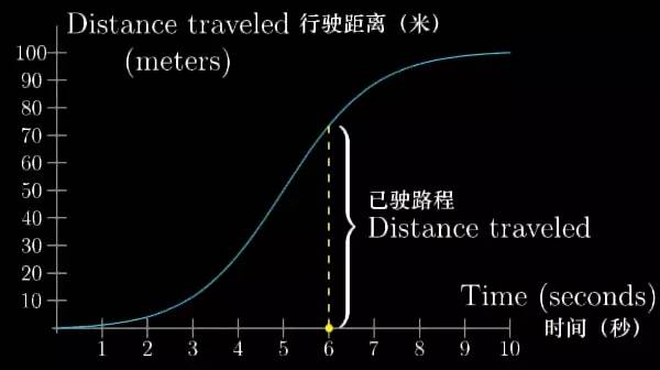 一开始这个曲线很平缓, 因为车刚开始发动速度很慢, 第 1 秒之内, 车没怎么移动, 而在接下里的几秒中, 汽车开始加速, 这对应的图像中越来越陡的曲线, 而车最后慢下来的时候,图像曲线又变得平缓了.
