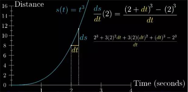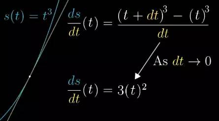 . 求导本来是一个很复杂的过程, 我们要计算微小时间差内的微小距离的变化, 让我们不看时间差具体有多少, 又要让时间差趋近于 0 . 想想就头大, 但是我们最后却得到了一个很简洁的式子 3t2