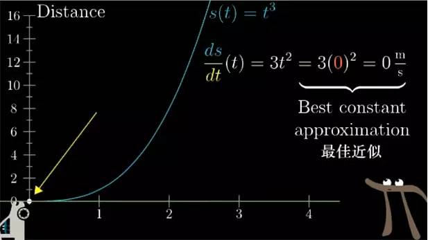这里导数等于 0 的意思是, 当时就的间隔变得越来越小时, 这个表示速度的比值就越趋近于 0 , 而这不表示此时车就是静止的, 只是说它此时的运动速度近似于均速的 0 .近似而已