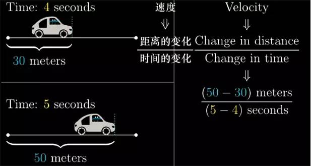 但是我们仔细考虑的话,讲一个瞬时的速度其实没有一点意义. 比如我们看一辆行驶中的汽车照片, 你肯定回答不出来,它是跑得有多快. 因为你需要拿出两个时间点来做比较, 那样你才能将距离改变的量除以时间变化量.